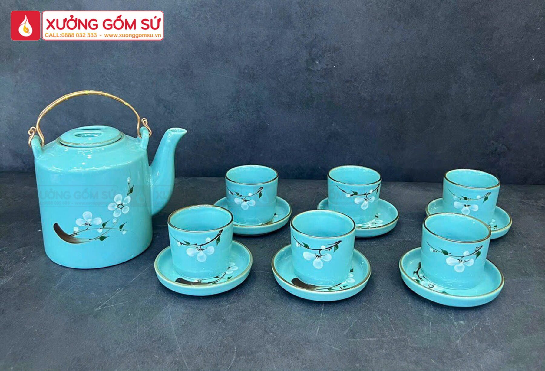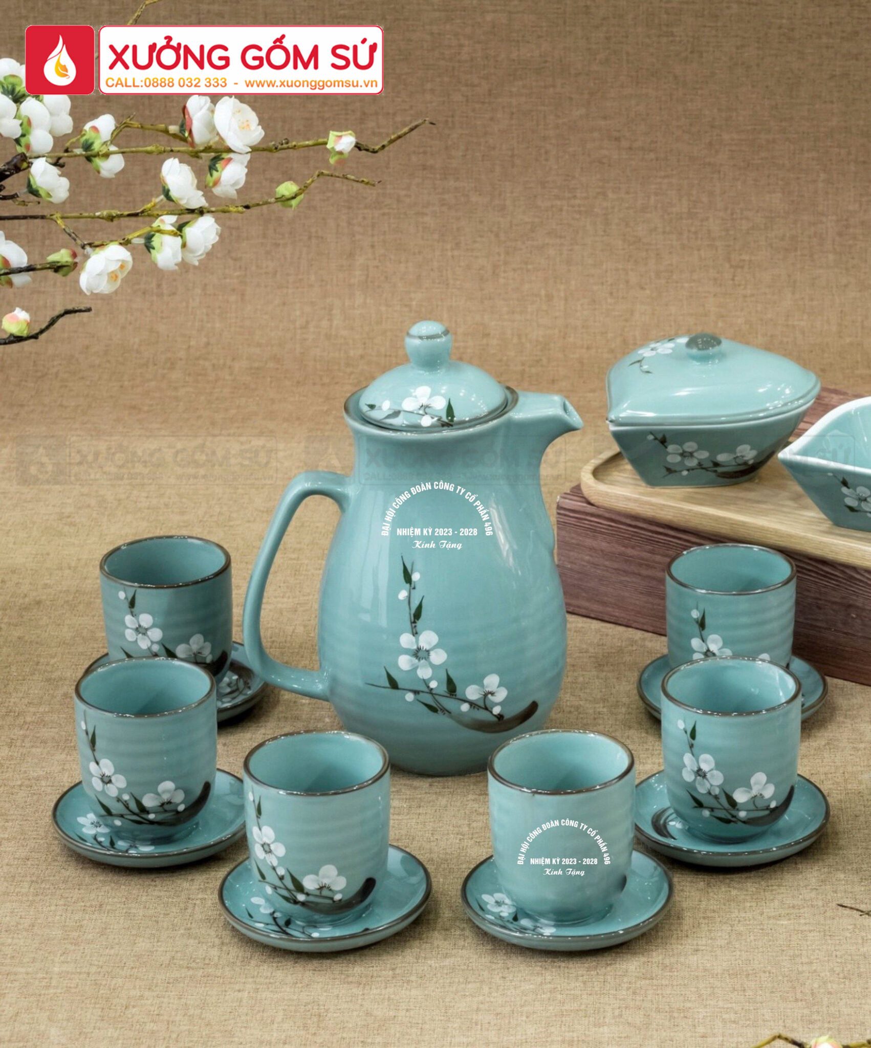 Bộ Ấm Tích Men Xanh Họa Tiết Hoa Đào Trắng Vẽ Tay