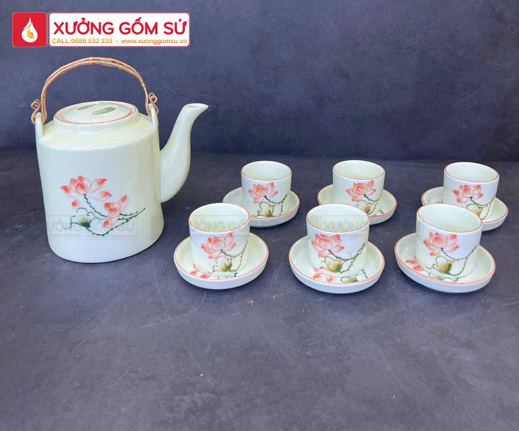 Bộ Ấm Tích Bát Tràng Quai Đồng Họa Tiết Hoa Đào Vàng