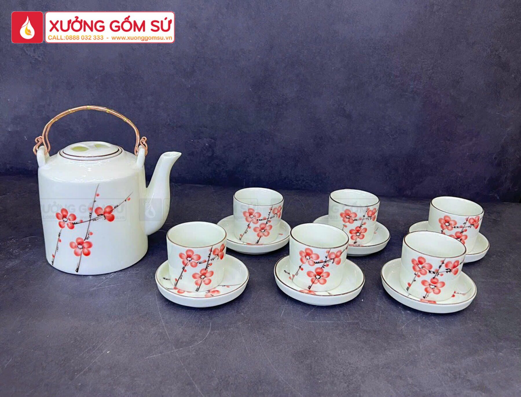 Bộ Ấm Tích Quai Đồng Họa Tiết Hoa Đào Đỏ