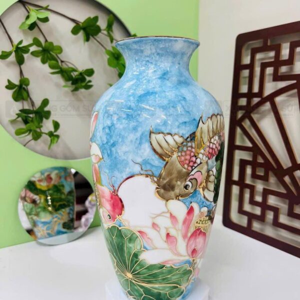 Hãy là người đầu tiên nhận xét “Bình Hoa Bát Tràng In Logo Họa Tiết Sen Cá LH-02101124”