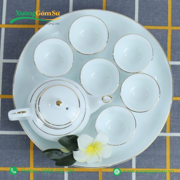 - Màu men trắng tinh khôi làm nền, kết hợp với những đường viền kẻ vàng tạo điểm nhấn tinh tế, sang trọng cho bộ trà. Kẻ chỉ có thể được vẽ theo nhiều kiểu dáng khác nhau, từ những đường thẳng đơn giản đến các họa tiết hoa văn cầu kỳ.