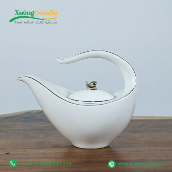 - Thiết kế độc đáo: Bộ ấm trà có thiết kế độc đáo với ấm trà có hình dáng cong mềm mại, phần miệng ấm uốn lượn như cổ thiên nga, tạo nên vẻ đẹp uyển chuyển và thanh thoát. Điểm nhấn đặc biệt là đường viền bạch kim tinh tế, tôn lên sự sang trọng và cao cấp của sản phẩm.