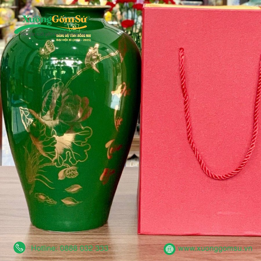 | Tên Sản phẩm | Lọ Hoa Men Màu Họa Tiết Vẽ Vàng In Logo Đại Hội |