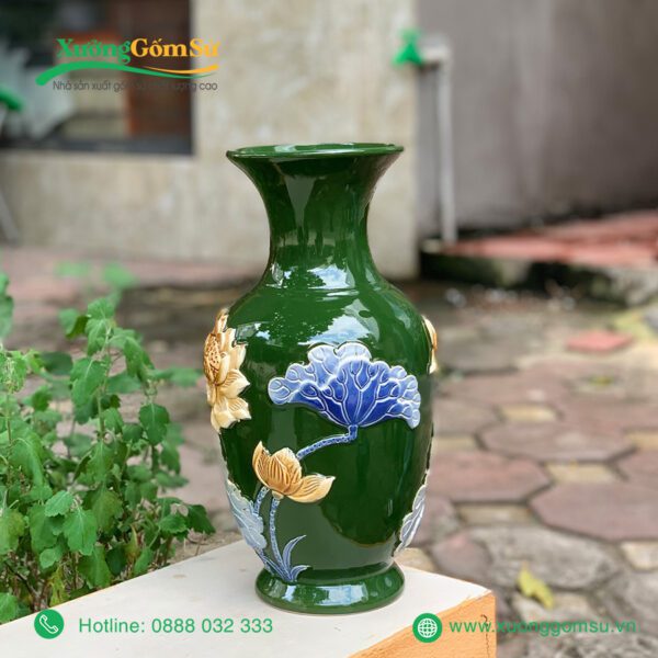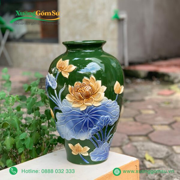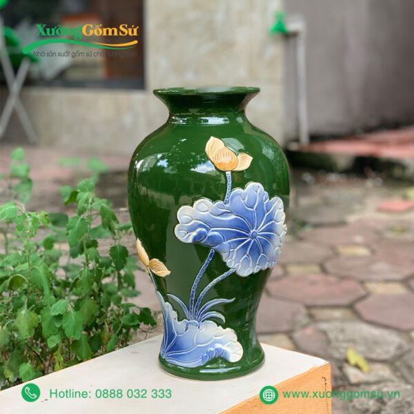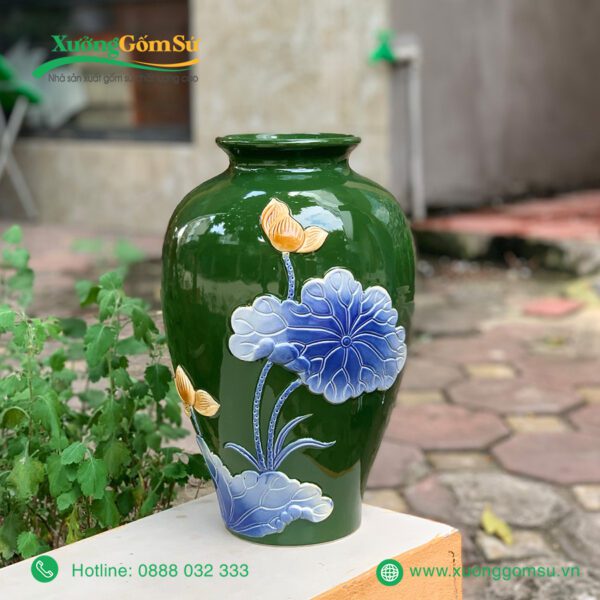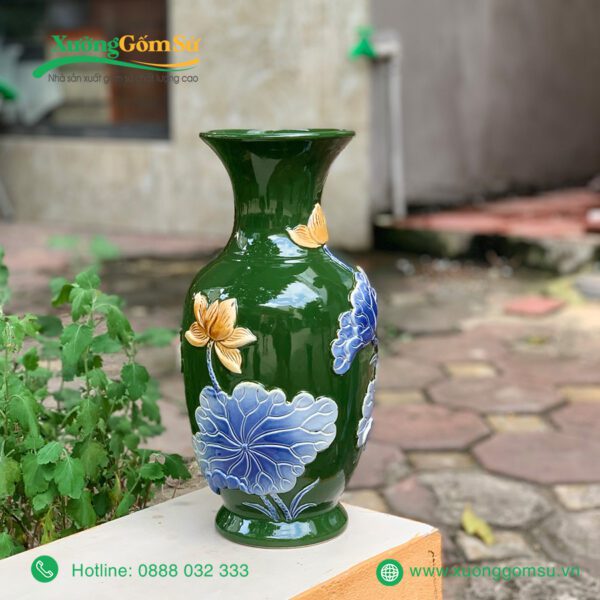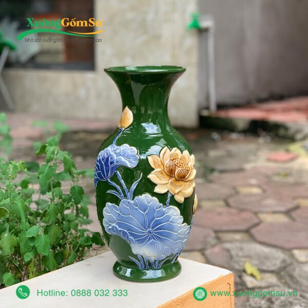 Lọ Hoa Men Xanh Lục Đắp Nổi là một tác phẩm nghệ thuật độc đáo, mang đậm nét truyền thống và tinh tế của Việt Nam. Lọ hoa kết hợp hài hòa giữa vẻ đẹp tự nhiên của hoa sen và kỹ thuật chế tác gốm sứ tinh xảo.