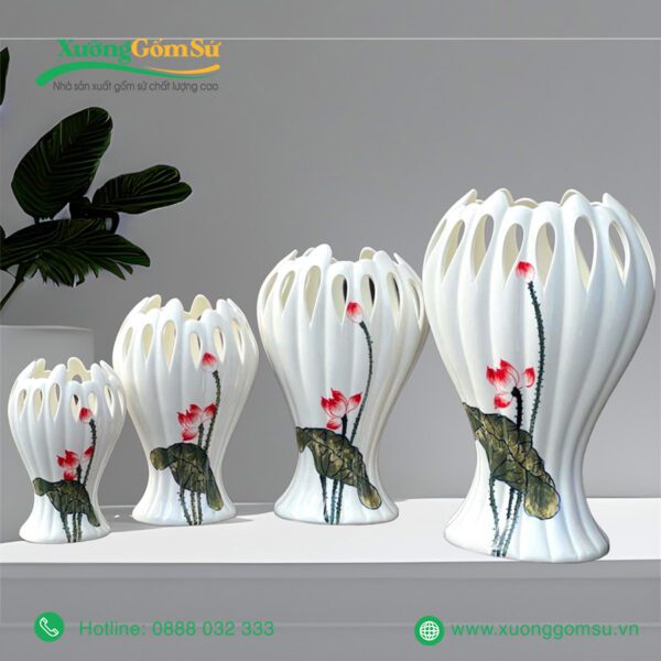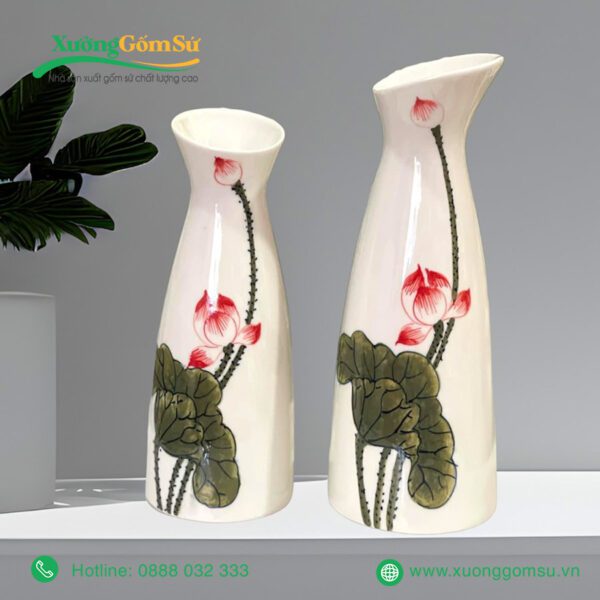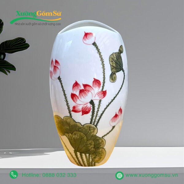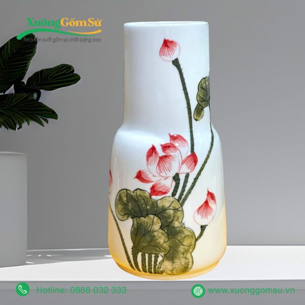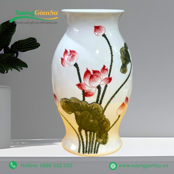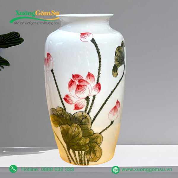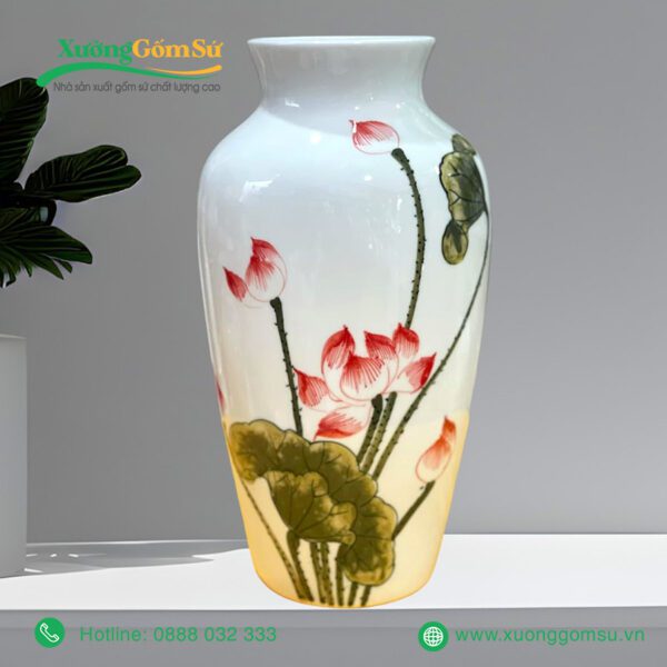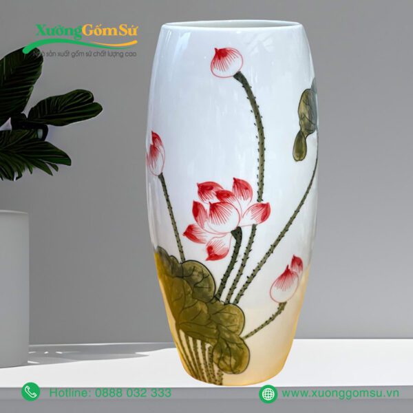 Lọ Hoa Sứ Bát Tràng Họa Tiết Hoa Sen Hồng Lá Xanh với hoa văn sen truyền thống của Việt Nam. Những bông sen được vẽ tay tỉ mỉ, khéo léo nổi bật trên nền sứ trắng, tạo nên một bức tranh sinh động