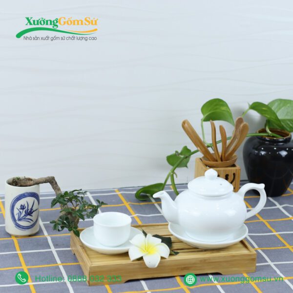 - Bộ ấm chén Bát Tràng dùng để trưng bày : Với nhiều kiểu dáng lớn nhỏ khác nhau, tròn bầu, hơi dẹt…Không họa tiết cầu kỳ nhưng Bộ Ấm Chén Sứ Trắng luôn được lòng khách bởi màu sắc trang nhã, dù là trắng trơn hay viền chỉ vàng, chỉ xanh dương đều giúp lưu giữ vị ngon của tách trà nóng, và khơi gợi cảm hứng cho người thưởng thức.